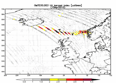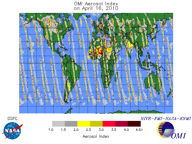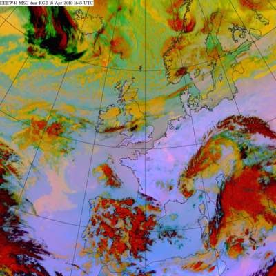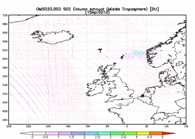 - Animation of volcanic plume impacting Europe - The data shows the concentration of ash in the atmosphere. The ash mass is calculated by combining multiple spectral channels from the EUMETSAT Meteosat-9 satellite's SEVIRI sensor. The latest image from April 19, 2010 is derived from the NASA Aqua/MODIS satellite sensor. These analyses, developed by NOAA scientists, can distinguish between clouds and other atmospheric aerosols.