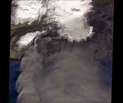 This Advanced Spaceborne Thermal Emission and Reflection Radiometer (ASTER) expedited view of the Eyjafjallajökull Volcano was acquired at 12:51 UTC on April 19, 2010 from a 705-km altitude on the Terra spacecraft. The image was generated using ASTER registered radiance at the sensor data, with visible and near-infrared (VNIR) bands simulating natural color. The ground resolution is 15 m. A billowing white and gray plume emanating from Eyjafjallajökull is visible drifting to the south and covering a large area. Expansive snow-covered areas appear white. Vegetation is visible in shades of green, with water dark blue. A density slice overlay using 90 m ground resolution thermal infrared (TIR) band 14 at 10.95 to 11.65 µm wavelengths approximates relative temperatures. The hottest pixels are portrayed in yellow, representing the highest TIR band 14 digital numbers in this scene. While still hot, the TIR pixels colored orange and red are at relatively lower temperatures. Another hot area representing an earlier and now-cooling flow is evident northeast of Eyjafjallajökull at Fimmvörduháls.