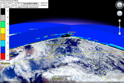 - From Andrey Savtchenko, NASA: KMZ of AIRS and CALIPSO - Full-resolution (3-km) AIRS Near-Real-TIme false-color imagery, and CALIPSO expedited browse Details
