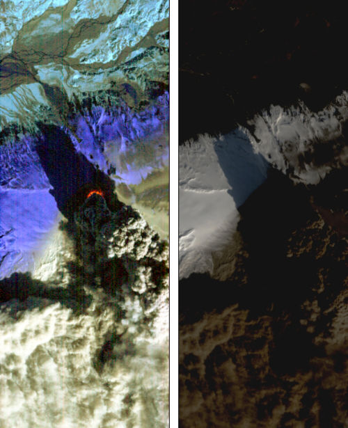From Stu Frye: EO-1 Hyperion image from yesterday [4/17] of the Iceland volcano shown as two side-by-side panels produced from two different spectral ranges,...the left one is SWIR and the right one is visible. In the SWIR, you can see the thermal vent and in the vis you can see the plume coating everything to the SouthEast making the ice brown/gray