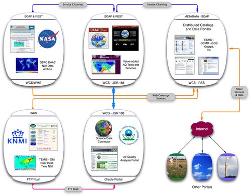 Figure 1. Schematic diagram by Frank Lindsay of the OMI data flow between the providers (NASA, ESA) and users (EPA and on the internet "cloud")