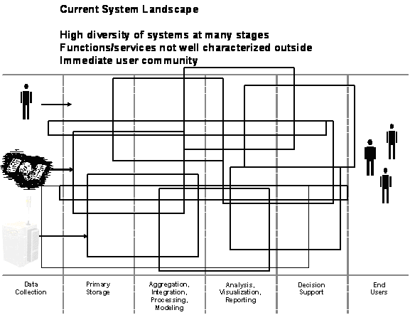 - Compiling, and providing information about known data sources (this would include a periodic and regular scan for unknown data sources) and enabling integration of additional supplementary data. Providing this information to end users is both a logistical challenge as well as a communications issue.