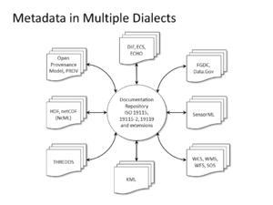 A dialect is a "variety of a language that is a characteristic of a particular group". In the context of data sharing in ESIP, the ways that different groups document their data and products (i.e. metadata standards) are great examples of dialects. They are varieties of the over-arching language of documentation that are used by particular groups in ESIP and other partners in the global environmental community. Figure 1 illustrates this idea with a few commonly used dialects.
