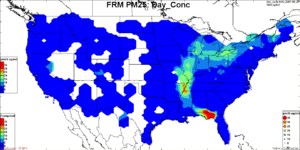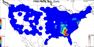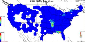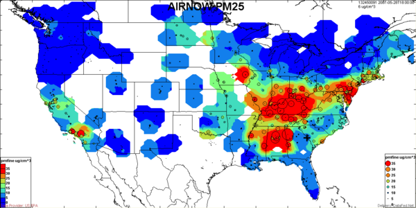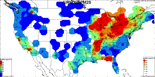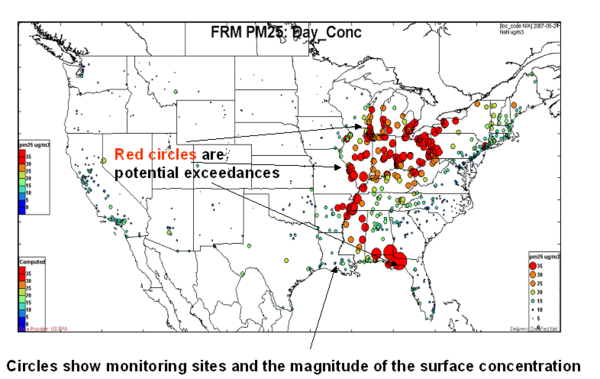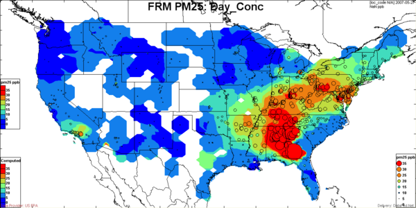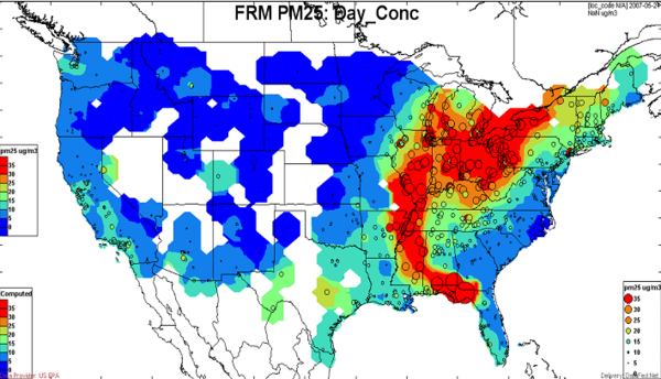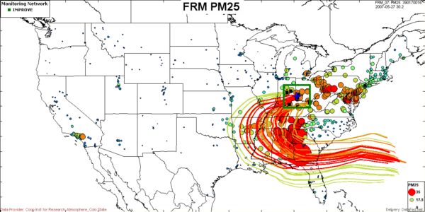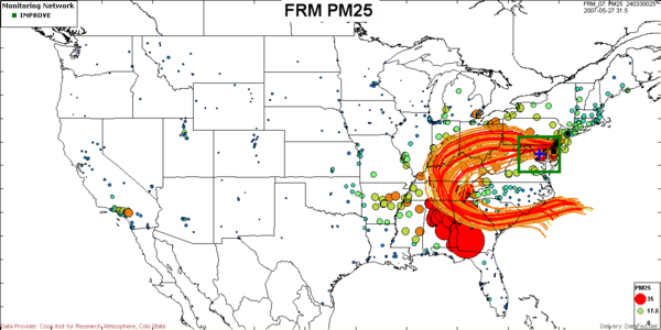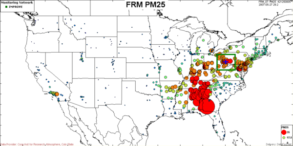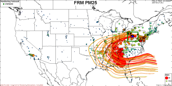 Observation: The images represent the FRM PM mass concentration based on daily average filter samples for May 24 and 27, 2007. A large swath of the eastern U.S. had PM2.5 concentration above 35ug/m3. The FRM PM2.5 daily average filter sample concentrations (top figure) and Airnow Continuous Monitor PM Concentration (bottom) shows a somewhat different spatial pattern. The PM2.5 mass measurements do not reveal whether these potential exceedances were due to known controllable emissions or due to exceptional causes.