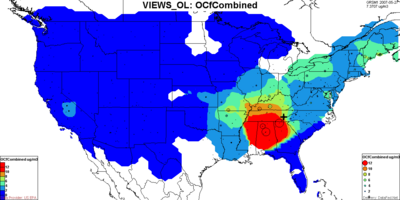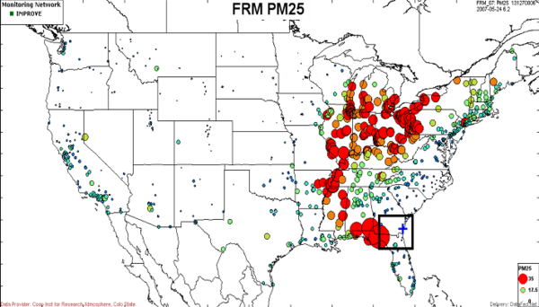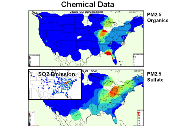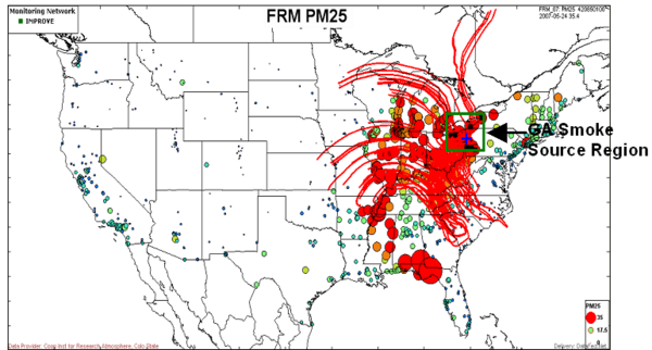 Based on the combined chemical data and backtrajectories it is evident that the high PM concentrations that are observed along the western edge of the red trajectory path is due to the impact of the Georgia smoke. On the other hand the high PM2.5 concentrations just north of the Ohio River Valley are primarily due to known, controllable sulfate sources.
