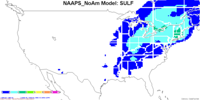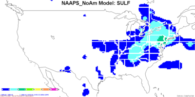 On May 27, the NRL NAAPS Global Aerosol Model again shows highest sulfate concentrations over the Northeast. There is also a simulated smoke concentration patch over the GA fires as well as in S. Ontario in Canada.
