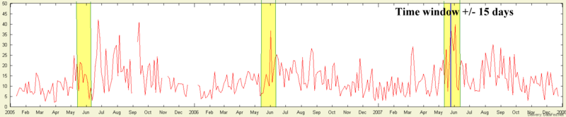 A useful measure of the "normal" concentration is the 84th percentile (+1 sigma) for a given station. In the illustration below, a time windows of +/- 15 days (one month window) was chosen. This period is longer than a typical exceptional event, but it is sufficiently short to preserve seasonality. In order to establish the normal values the concentrations can be averaged over multiple years for the given time window measured in Julian days, i.e. days between 160 and 190. Hence, a particular sample is considered anomolously high (deviates from the normal) if its value are substantially higher than the 84th percentile of the multi-year measurements for that "month" of the year. See Help:Using the Concentration Anomaly Tool to learn how to change these parameters.