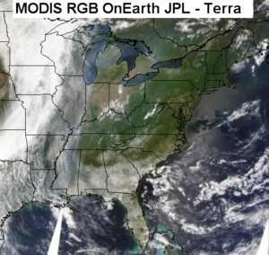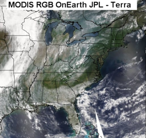 The true color MODIS images from Terra (11am) and Aqua (1pm) show a rich texture of clouds, smoke/haze and land. The clouds over Georgia are clearly evident. Inspection of the images shows evidence of smoke/haze along the Mississippi River as well as over the Great Lakes.
