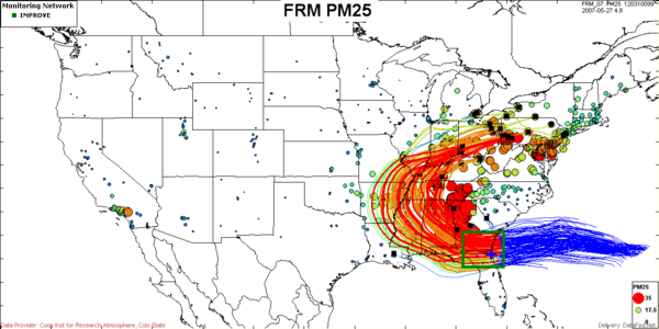 - The pre-computed backtrajectories used in this analysis are only available for IMPROVE and STN sites. Since there are much more FRM PM2.5 sites, many monitoring stations do not have backtrajectories. As a result, there are sites with red circles (>35 ug/m3) without backtrajectories for airmass transport analysis.
