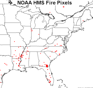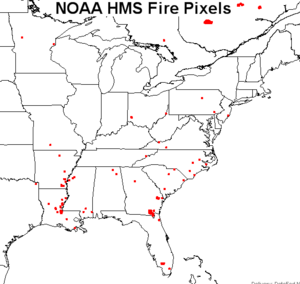 The fire pixels, obtained from satellite and other observations, provide the most direct evidence for the existence and location of major fires. In the above map of fire pixels, the cluster of fires in southern Georgia is evident.