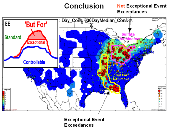 Conclusion: On May 27, the exceedances were clustered downwind of the GA smoke source. The multi-state region over parts of GA, AL, TN had low SO4 concentration (< 6 ug/m3), high OC concentration in excess of 10 ug/m3 and backtrajectories pointing toward the GA fires as the source of the organics. Thus, it is concluded that these exceedances over GA, AL, TN would not have occurred but for the impact of the GA smoke plume.