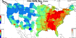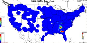 The images below show the concentration of FRM PM2.5 as circles at each of the monitoring sites that report data on a given day. The magnitude of the circles' diameter is proportional to the concentration. The concentration is also color coded for the interior of the circles: blue represents the lower end of the concentration scale, while red indicates the higher end. By setting the scale maximum to 35 ug/m3, the red circles represent samples that may potentially be in non-compliance of the daily PM2.5 standard.
