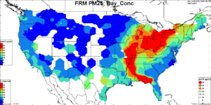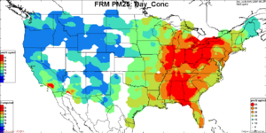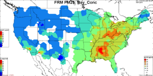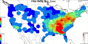 Observation: The top image represents the FRM PM mass concentration based on daily average filter samples. The bottom image shows the corresponding Airnow PM2.5 concentration as a snapshot of the hourly data at 18:00:00 UTC (12 PM Eastern Time).