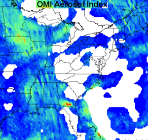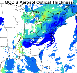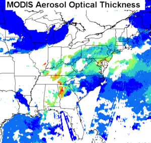 The Aerosol Optical Thickness (AOT), derived from MODIS Sensors (Terra and Aqua satellites), shows a data void over Georgia due to clouds.