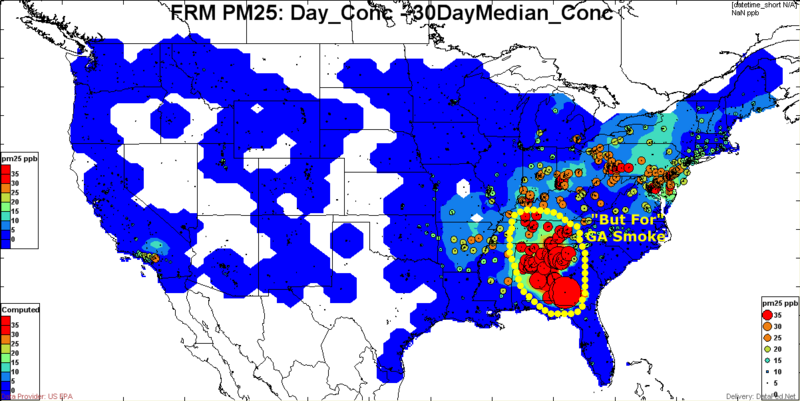 Based on the above analysis, it is now possible to delineate the regions of the Eastern Us of which the potential exceedances occurred but for the presence of the Georgia Smoke, which caused an exceptional event.