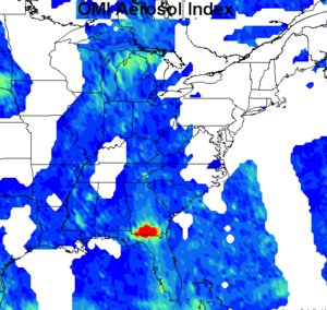 Observation: The satellite based fire pixels show the location of the southern Georgia fire. The satellite-based optical thickness values indicate the presence of substantial amount of emitted smoke. These provide evidence that there is a potential source for exceptional aerosol events due to biomass smoke. Auxiliary and qualitative observations can provide additional evidence and confirmation for the occurrence of exceptional events.