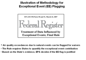 The Exceptional Event Rule is an extension of the existing Air Quality Standards. The Rule permits States to flag air quality data caused by exceptional air pollution, such as forest fires and dust storms. These flags are then considered in establishing the compliance of a given site with the National Air Quality Standards. The Rule also requires that for every flagged observation, the States quantify the contribution of the exceptional event. Based on the State’s evidence, EPA decides if the EE flag is justified.