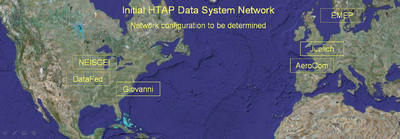 Figure 2.1 Initial (DataFed, Juelich) and planned (Giovanni, AeroCOM, EBAS) nodes of the HTAP Data Networks.
