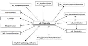 This Figure shows the principle objects included in the ISO Metadata Standard and whether they are contained by MI/MD_Metadata or by MD_DataIdentification. Pages in the ISO 19115 Category give more information for many of these objects.
