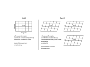 The Simple netCDF File Figure shows two cases that can be used to explore ISO tools for describing grids. The left side of the Figure shows a two dimensional grid of temperature, a clear candidate for georectified or georeferenceable depending on the spacing of latitude and longitude. The right side shows the same variable in a satellite swath. In this case the latitudes and longitudes of each pixel are provided in two grids that share the i and j axes with the physical measurement. This case is definitely georeferenceable.