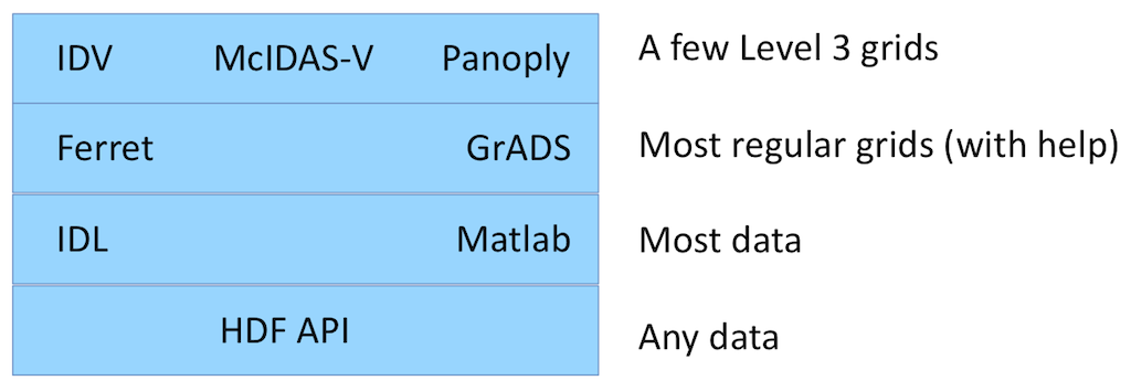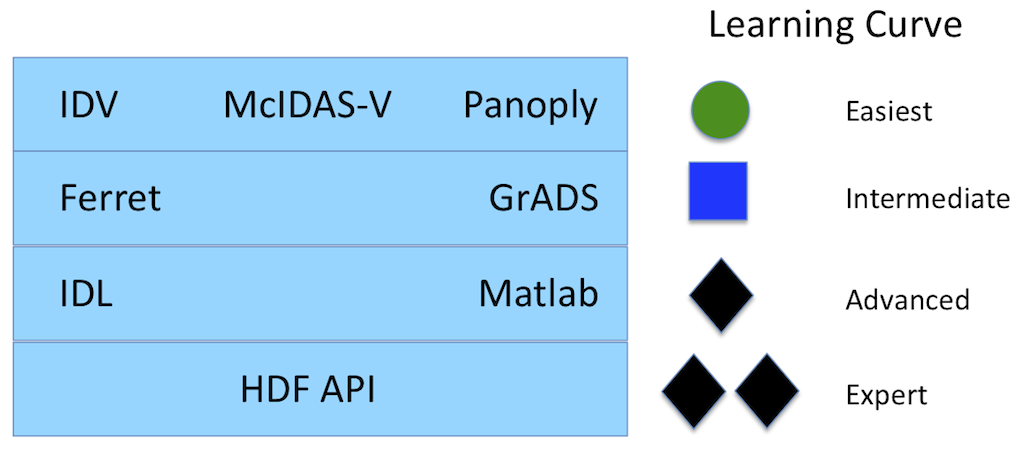 - Tool developers at Goddard Institute for Space Studies (Panoply), Unidata (IDV), U. Wisconsin (McIDAS-V), Pacific Marine Environmental Laboratory (Ferret) and Institute of Global Environment and Society (GrADS)