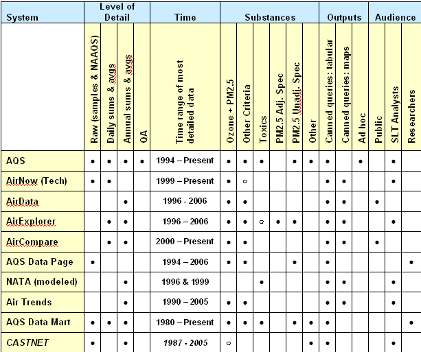EPA is developing a “portal” to list all of the sources of air quality (and emissions) data that are available and link directly to their access pages. This portal is at the following web address: http://www.epa.gov/oar/airpolldata.html. Below is a table comparing key information about each of the available EPA-maintained systems for air quality data (including AirNow and CASTNET which contain data not in AQS). The systems are described at the link above. (Key: a filled circle means “yes” and an empty circle means “some”.)