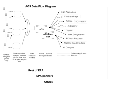 The main part of the diagram shows the major components of the EPA’s Air Quality System (AQS). Beginning from the left hand side, samples are collected in the field by monitors. Some of these samples are analyzed in situ, others are collected by the State, tribal, or local agency responsible for the monitor and analyzed at laboratories. Either way, the agency responsible for the monitor is also responsible for ensuring the measurements are reported to AQS. It should be noted that only monitors within the EPA national ambient air quality monitoring network must have their data reported to AQS, for other monitoring networks or special studies (e.g., The Texas PM2.5 Sampling and Analysis Study) it is optional and the information may be stored in another system (e.g., NARSTO).