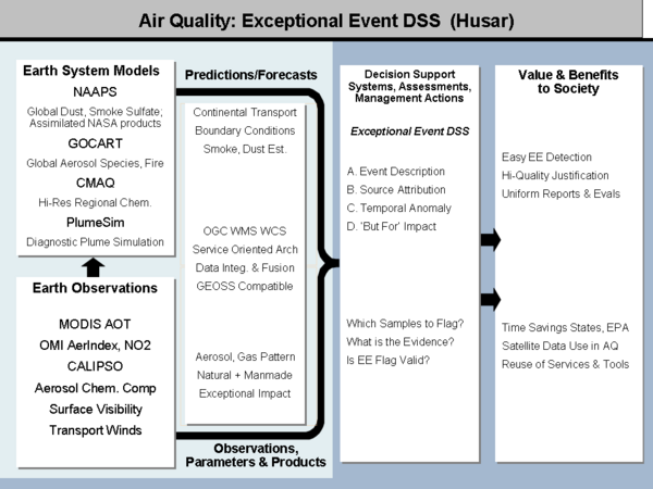 The broader benefits of this are project will include deeper scientific understanding of EEs and innovative application of remote sensing and information technologies to AQ regulatory processes. Building the EE DSS will also contribute to the creation of a persistent core network for supporting other AQ applications. The network will also exemplify multi-organization/agency collaboration using the principles and architecture of the Global Observing System of Systems.