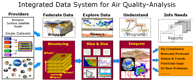 Rudolf Husar's "Collaboration Through Virtual Workgroups" project (NSF ATM-ITR small grant #0113868, $445,768, 9/01/01 to 8/31/04, ITR 2001-2004) found that web services are mature enough for integration of distributed, heterogeneous, and autonomous datasets into homogeneous, federated datasets. The developed DataFed (http://datafed.net) tools allowed real-time, 'just-in-time' data analysis for the characterization of major air pollution events.