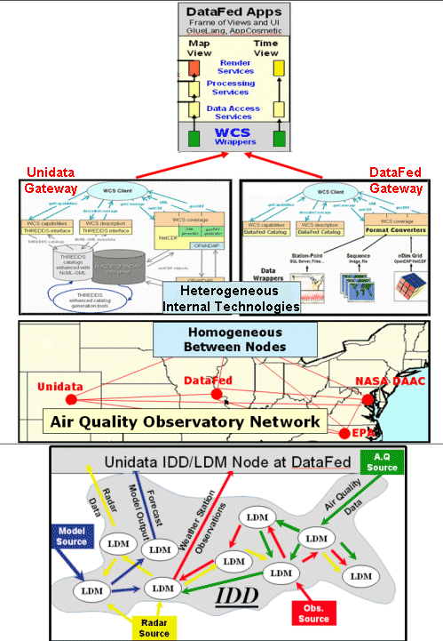 The AQO network will consist of nodes which can be used both as servers as well as clients of air-quality-relevant data. The nodes will belong to different organizations, that serve a variety of communities, and that have different data needs. There is also considerable heterogeneity in which the nodes conduct their business internally: finding, accessing, transforming, and delivering data. In Figure 3, the Unidata and DataFed netwok nodes are shown in more detail.