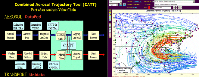 Figure 4 illustrates the current capabilities of the tool that highlights in red the airmass trajectories that carry the highest concentration of sulfate over the Eastern US on a particular day. Currently, the real-time application of such a diagnostic tool is not possible, since the necessary IT infrastructure for bringing together and fusing the AQ and transport data does not exist.