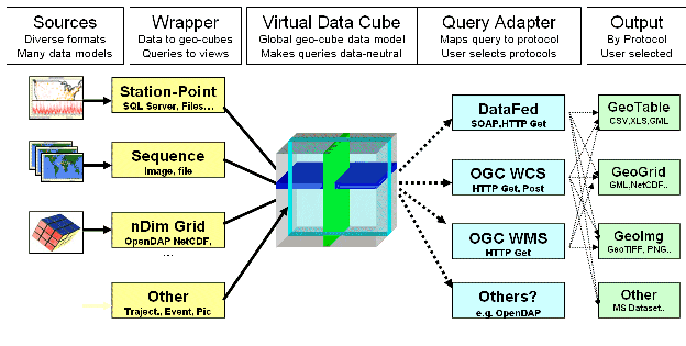 The interoperability of these heterogeneous systems can be achieved through the adaptation of a uniform query protocol such as provided by the OGC Web Coverage Service. To achieve this level of interoperability, a significant role is assigned to the adapter services (Figure 3) that can translate data formats and make other adjustments of the data syntax. These services can be provided by the data server, by the client or by third-party mediators, such as DataFed and Unidata. This type of “loose coupling” between clients and servers will allow the creation of dynamic, user-defined processing chains.