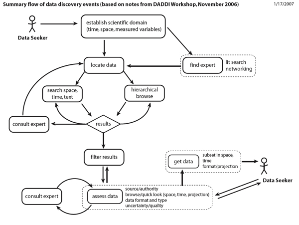 The use case begins when the Data Seeker establishes a general research question. The nature of the question determines the spatial and temporal domain of the search and the types of data to be sought.
