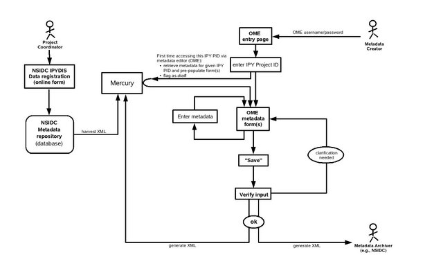 - The use case begins when the Project Coordinator registers a project description and provides initial project metadata to the Data Archiver (for example, using the online NSIDC IPYDIS data registration form).