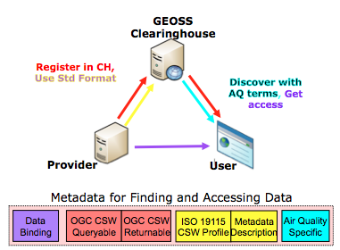 Metadata needed for Data Binding (purple box) is encoded in ISO 19119 Service metadata. This metadata identifies what kind of services are available, links to GetCapabilities, DescribeCoverage and example GetCoverage or GetMap are listed. The red and yellow boxes for OGC CSW Core Queryable/Returnable fields and the ISO 19115 Metadata CSW Profile are all fields included for finding metadata within the GEOSS GeoNetwork Clearinghouse, which operates using CSW service interfaces and an ISO 19115 profile. The blue box is the Air Quality-specific metadata, which currently only includes the keywords needed for the AQ Community faceted search engine, uFIND. The facets are: Dataset, Parameter, Instrument, Platform, Domain, Topic Category, Temporal Resolution, Vertical, DataType, Data Distributor, Data Originator. The above facets are included for the AQ user to easily find the data. This additional metadata allows for sharp queries to be given in the parameter space, time, and physical space. Another feature of the user-centric system is that using web analytics additional metadata is attached to each dataset in order to provide information about dataset usage characteristics.
