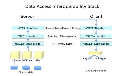 The interoperability stack is composed of stack of layers. Each layer in the stack constitutes a standard or convention, i.e. a constraint. In the above example, the lowest layer is the netCDF data layer with the array data model. The array data model is flexible and has few constrains on the structure and content of the netCDF files. While netCDF data are fully accessible through the standards APIA, clients can not fully understand the content of the netCDF files. In the next CF-Conventions layer, semantic constraints are added including standard definition of array dimensions, and standard names of the variables. Files following the CF-netCDF convention are self-describing and understandable by the clients. The WCS layer imposes standards-based subsetting of CF-netCDF files based on space-time constraints specified by the client.