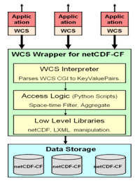 At the lowest level are open source libraries for accessing netCDF and XML files. At the middle level are Python scripts for extracting spatial/temporal subset slices for specific parameters. At the third level is the WCS interpreter, that parses the WCS query from the url and produces XML envelopes for returning data to the client.