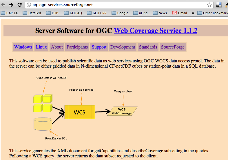 The software is hosted at http://aq-ogc-services.sourceforge.net/ and contains all the standard tools: downloads, tickets and discussions. The development page describes the use of darcs which is the version control system, and how to participate in the actual codebase.