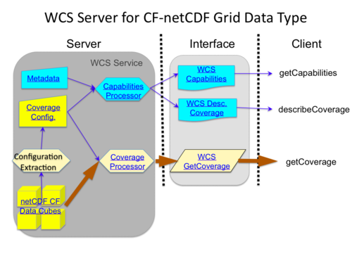 The functionality of the server software consists of preparing the two metadata XML documents that implements the coverage processor that reads the getCoverage query, reformulates the query for the local data access, extracts the requested data subset, reformats the data package as a CF-netCDF data package and returns the requested payload to the client.