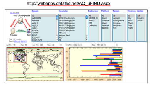 AQ uFIND This is a web program that is used to find WMS and WCS services. It gets it contents by reading ISO 19115 Metadata documents from GEOSS Clearinghouse Service Registry. The user interface filters the service list by keywords like Parameter, Domain, Originator etc... The Datafed Browser can be then used to view the service data.