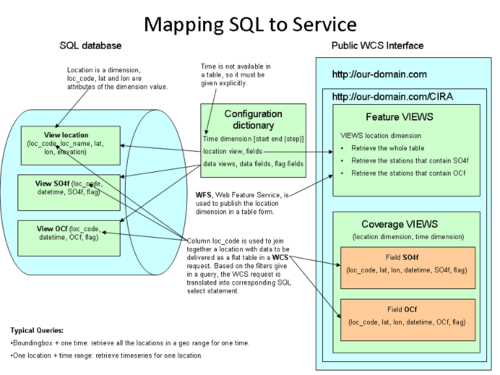 SQL DB Data Tables: If you store your station point data in a normalized manner, and you have your database indexed, you most likely can serve the WCS data as is. The WCS Wrapper Configuration for Point Data explains with detailed examples how to create views in your station point data database so that it can be a service by simply aliasing the tables and fields to coverages. It also shows how to create views to the location and data tables.