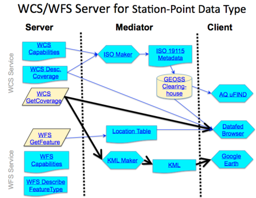 This section describes the design and implementation of portable WCS server software for station-point data types. The server software constitutes the main contribution of this Pilot to HTAP and to GEOSS. The purpose of the software is to minimize the most significant impediment to networking of air quality data systems: data access through standard-based web services. Since 2005 a number of demonstration projects were conducted to show the potential benefits of WCS data access protocol to access and use remote air quality data. The developments were reported in a series of GEOSS workshops: User and the GEOSS Architecture. In spite of the fact that over the past five years several organizations have committed considerable effort and attention, there are only a few operating WCS data servers that deliver air quality-relevant Earth observations or models. The number client nodes that consume WCS services is even less. As a consequence, in 2010 Service Oriented Architecture (SOA) for agile application building remains to be vision.