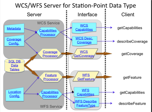 The functionality of the WCS/WFS server software consists of capabilities processors, that execute capabilities/describeCoverage/describeFeature queries, turning the Metadata/coverage config/location config data into the XML documents, and coverage/feature processors, that reads the getCoverage/getFeature query, reformulates the query for the local SQL data access, extracts the requested data subset, reformats the data package as a CF-netCDF or CSV data package and returns the requested payload to the client.