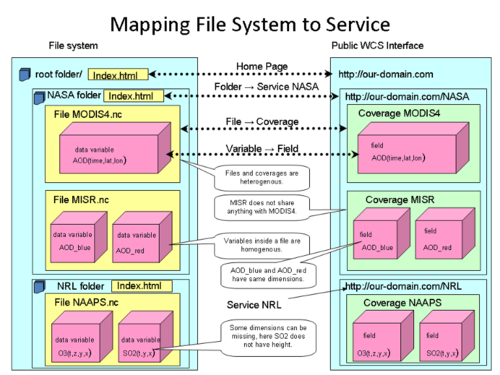 In File system, the root folder contains project folders. A project folder contains CF-netCDF files. Each netCDF file contains a set of variables. In a netCDF file, data variables share dimensions. In the data access service, WCS 1.1.2, the computer can contain services. A service contains coverages and each coverage contains fields. In a coverage, fields share dimensions. A particular server computer can host several OGC services, which are not necessarily related to each other. Within a given WCS service, the coverages can be independent, and may have different dimensions and units. Inside a coverage, all the fields have to share the same space and time dimensions. That yields to a natural mapping where a folder becomes a service, a file becomes a coverage and a variable becomes a field.